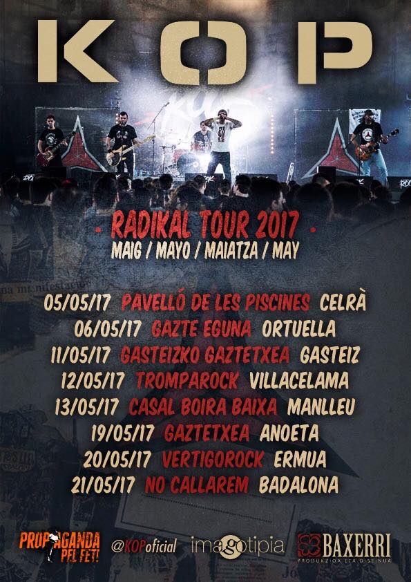 KOP continua amb força la gira ‘Radikal Tour 2017’, amb la qual estan presentant enguany el seu darrer llibre i doble disc ‘Radikal’ (Propaganda pel fet! 2016) arreu de la geografia peninsular. Aquest mes de maig el grup assaltarà 8 escenaris amb els seu potent espectacle, així que ja podeu anar marcant amb vermell i punta grossa les dates, que seran sonades! El descontrol començarà el dia dissabte 6 fins al Gazte Eguna de Ortuella. El següent cap de setmana serà de triplet i KOP l’encetarà el dijous 11 al Gaztetxe de Gasteiz, per visitar el festival Tromparock de Villacelama el divendres i rematar el dissabte 13 a Manellu. Les tres darreres descàrregues estan previstes pel , el 20 al festival VertigoRock d’Ermua i, finalment, el diumenge 21 de maig al festival per la llibertat d’expressió ‘No Callarem’ a Badalona juntament amb artistes com Albert Pla, Valtonyc, ZA!, Lágrimas de Sangre o Maika Makovski entre molts altres.