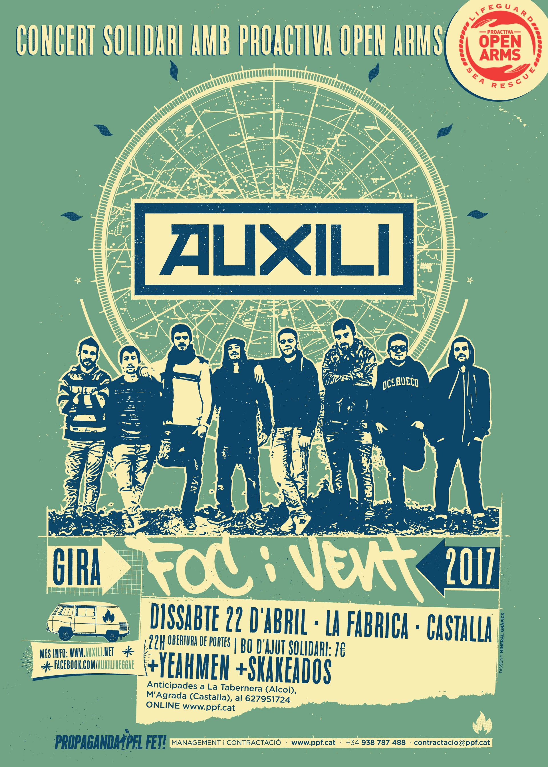La reggae band ontinyentina Auxili començà al seva gira d’enguany fa poques setmanes a Madrid i ja ha actuat a les Trobades 2017 de l’Escola Valenciana, a la Telecogresca 2017 junt als reggae masters francesos Dub Inc i en poques setmanes passarà una altra vegada pel ViñaRock. El grup ja està concentrat en la preparació del seu nou disc i aquest estiu actuarà amb menys intensitat que els darrers dos anys. És per això que la propera cita d’Auxili als escenaris, el 22 d’abril a La Fabrica de Castalla, serà una de les poques oportunitats de veure el grup a terres alacantines aquest any. A més, la cita és doblement especial, doncs el concert del 22 d’abril és un esdeveniment 100% solidari amb Proactiva Open Arms, l’organització sense ànim de lucre que està realitzant una tasca titànica de salvament i socorrisme en l’arribada de refugiats a les costes gregues. El bo d’ajut és només de 7€ si us afanyeu a fer-vos amb el format anticipat: completaran el cartell els grups Yeahmen i Skakeados i l’aforament és limitat! No badeu!