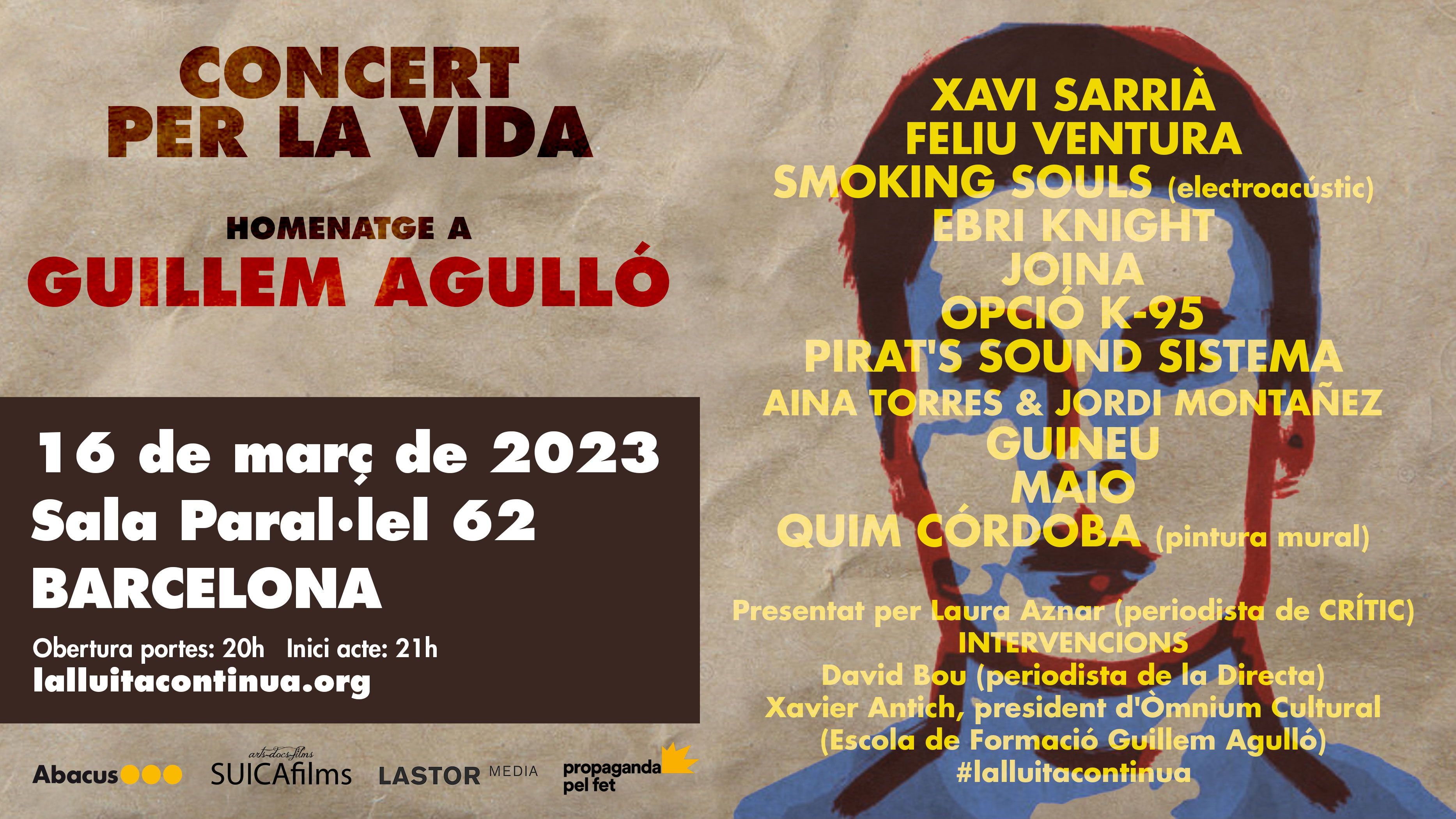 El “Concert per la vida” de Barcelona ha estat dissenyat com un homenatge musical en directe i inclourà actuacions Xavi Sarrià, Feliu Ventura, Smoking Souls, Ebri Knight, Joina, Opció K-95, Pirat’s Sound Sistema, Guineu, Maio, Aina Torres & Jordi Montañez i Quim Córdoba a la pintura mural i les intervencions de David Bou, Xavier Antich i la família Agulló - Salvador